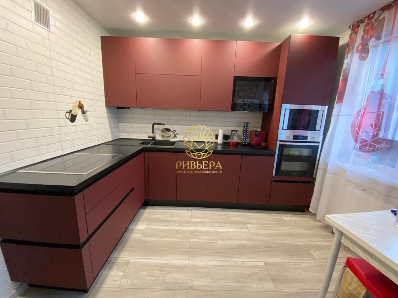 На кухне установлен большой немецкий встроенный кухонный гарнитур с варочной поверхностью BOSCH, доводчиками Blum и духовым шкафом. Также предусмотрено место для встроенной посудомоечной машины, микроволновой печи и телевизора.