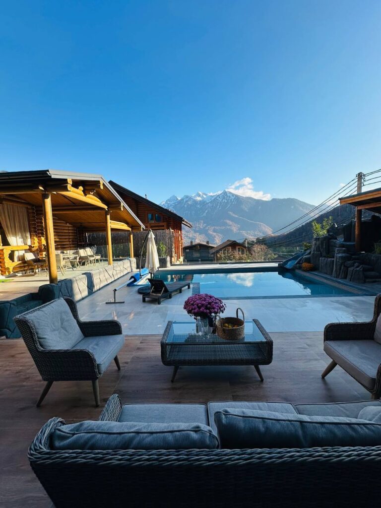 • бассейн 9*5м , с подогревом, с горкой и с противотоком .