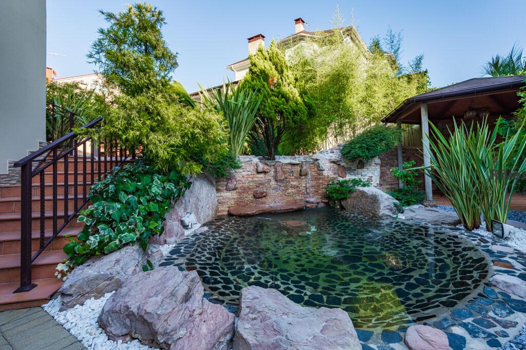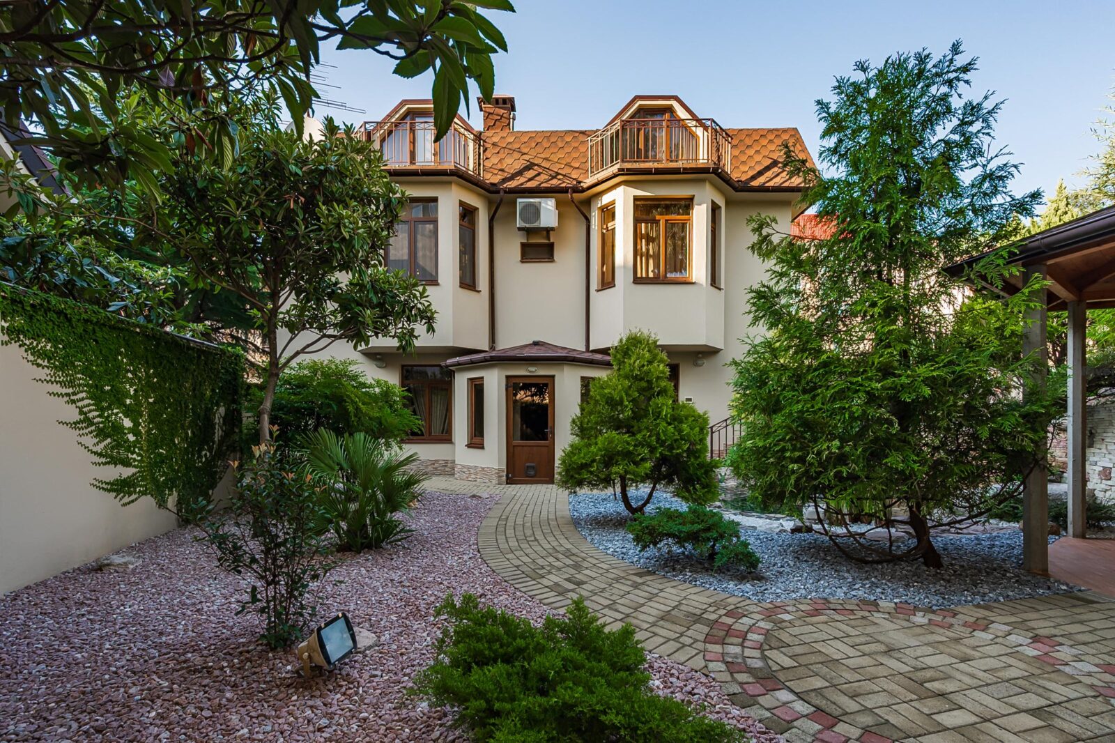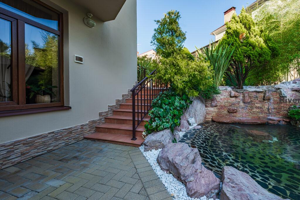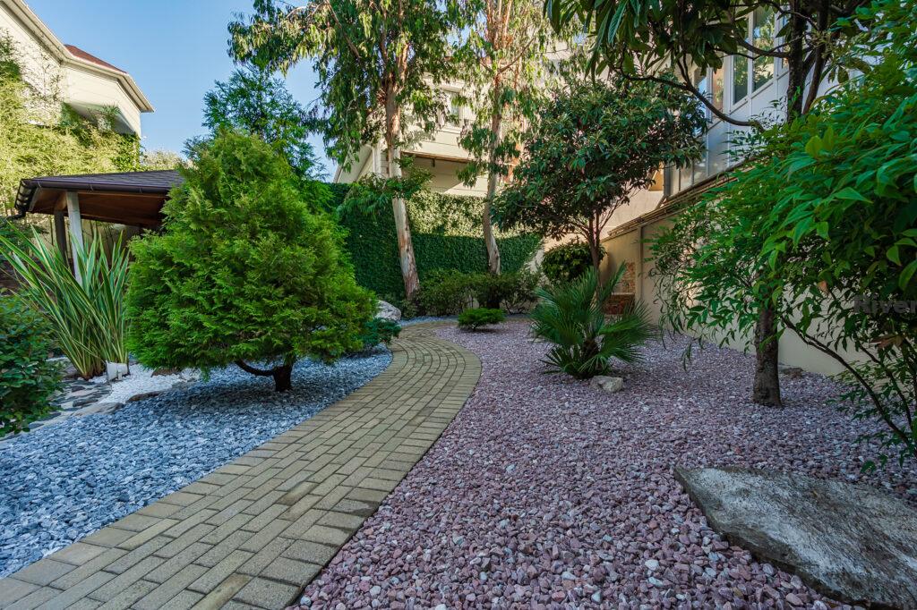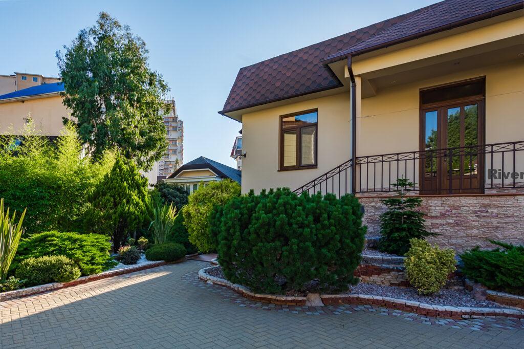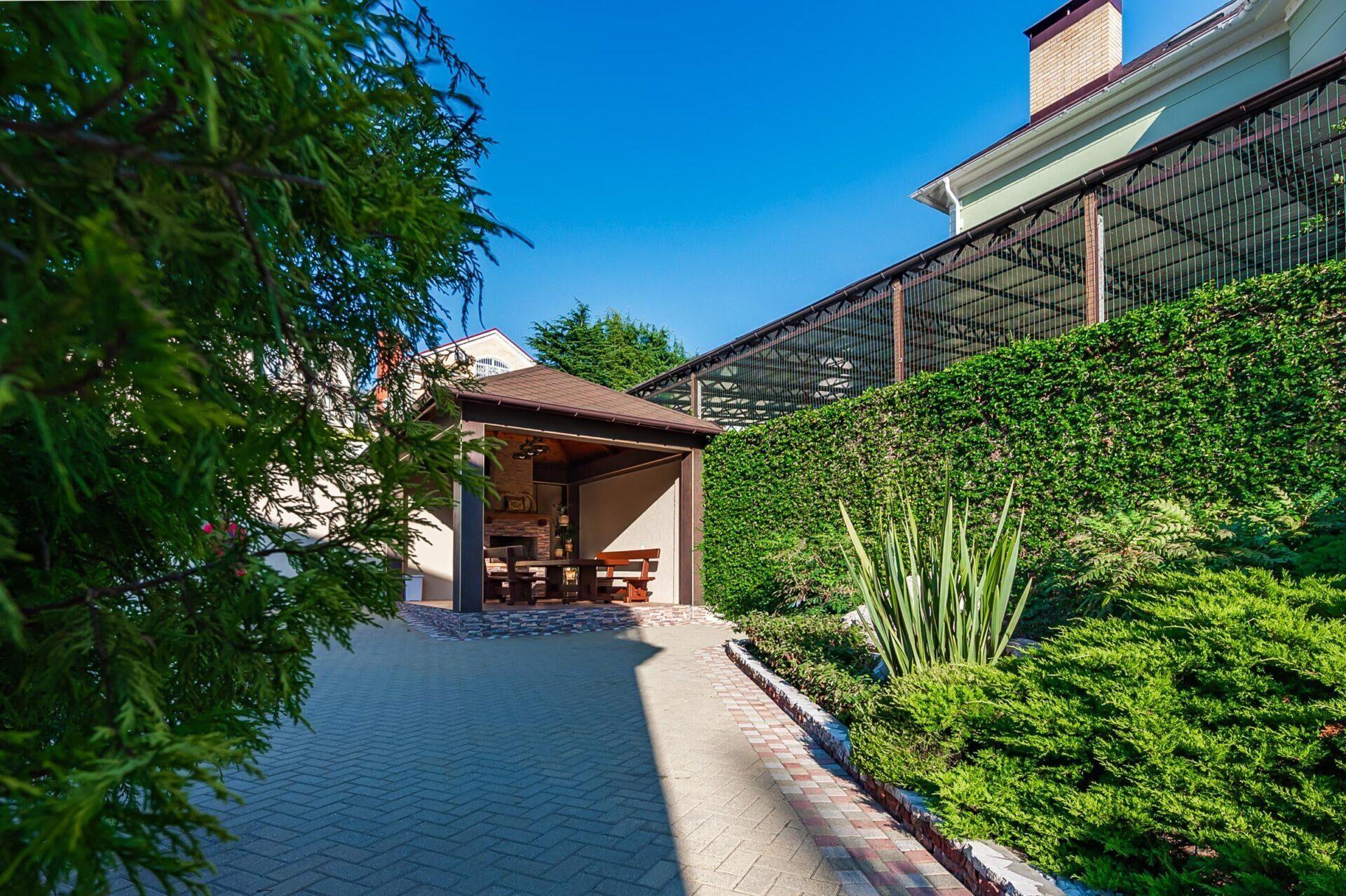 Во дворе выполнен ландшафтный дизайн, что создаёт приятную атмосферу для отдыха и проведения времени на свежем воздухе.