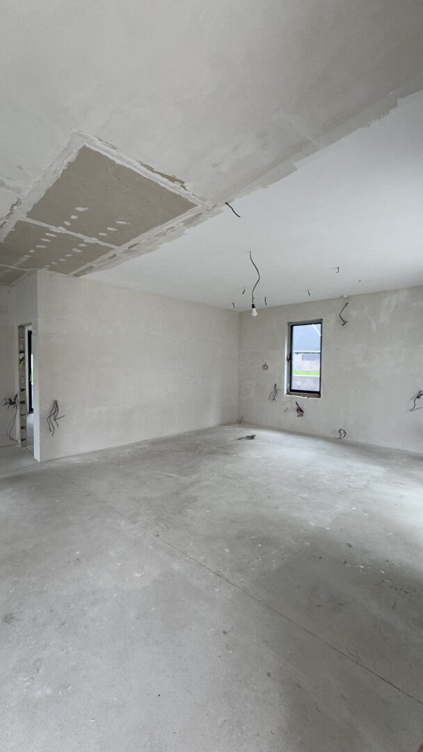 • Стены отштукатурены, сделана стяжка пола и установлены гипсокартоновые потолки.